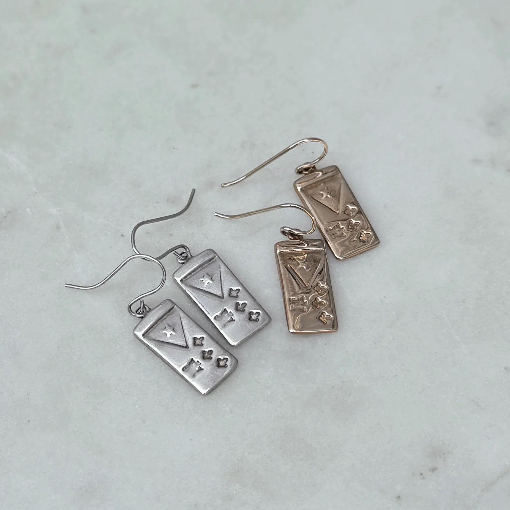 Each earring measures approximately 3/4" tall x 3/8" wide and weighs about 2.55 grams in bronze (about the weight of one penny). Each hangs from gold-filled or sterling silver ear wires. All our ear wires are nickel free.