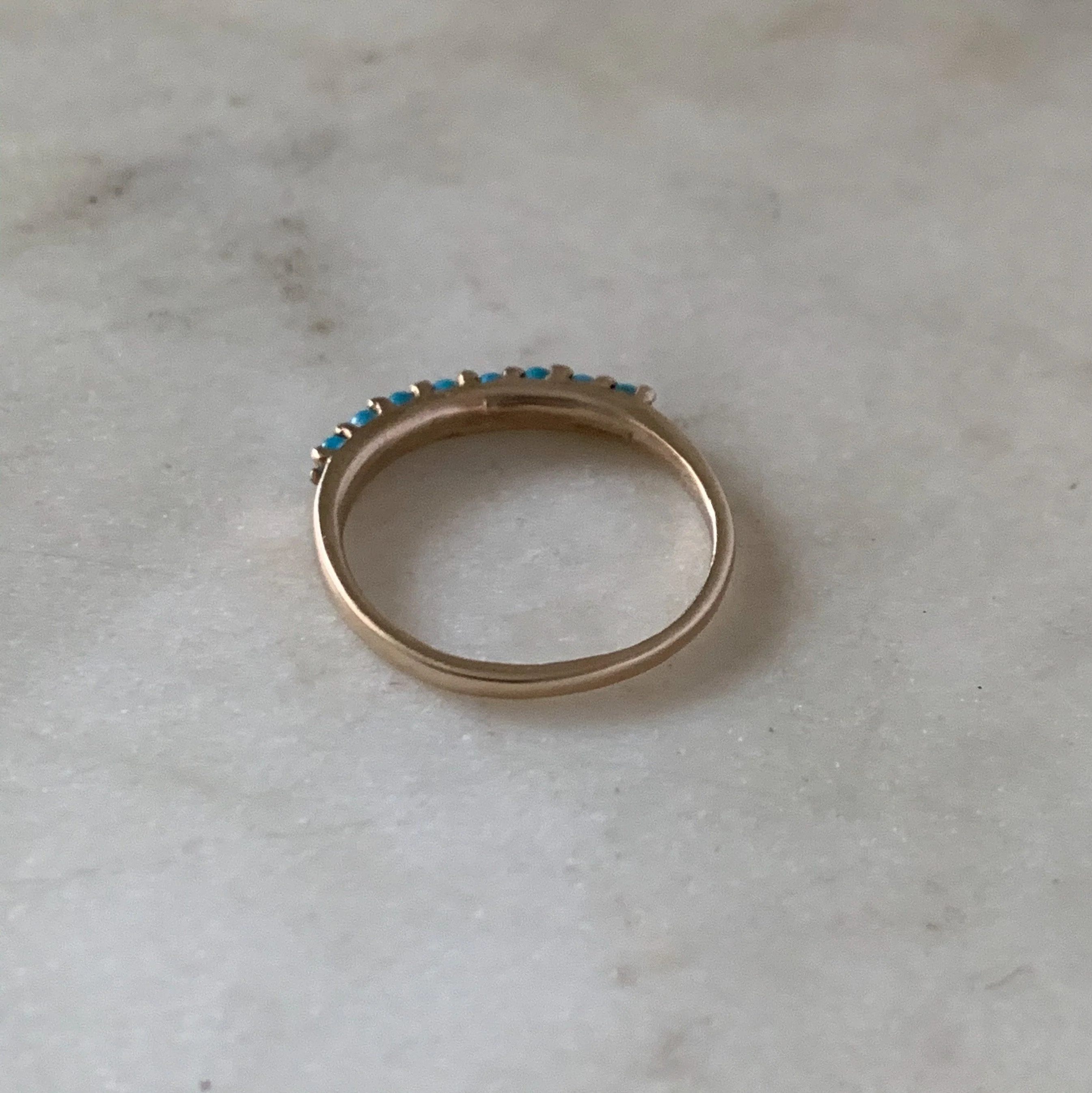 Eight 2-millimeter turquoise stones are hand-set in this simple and delicate ring.
