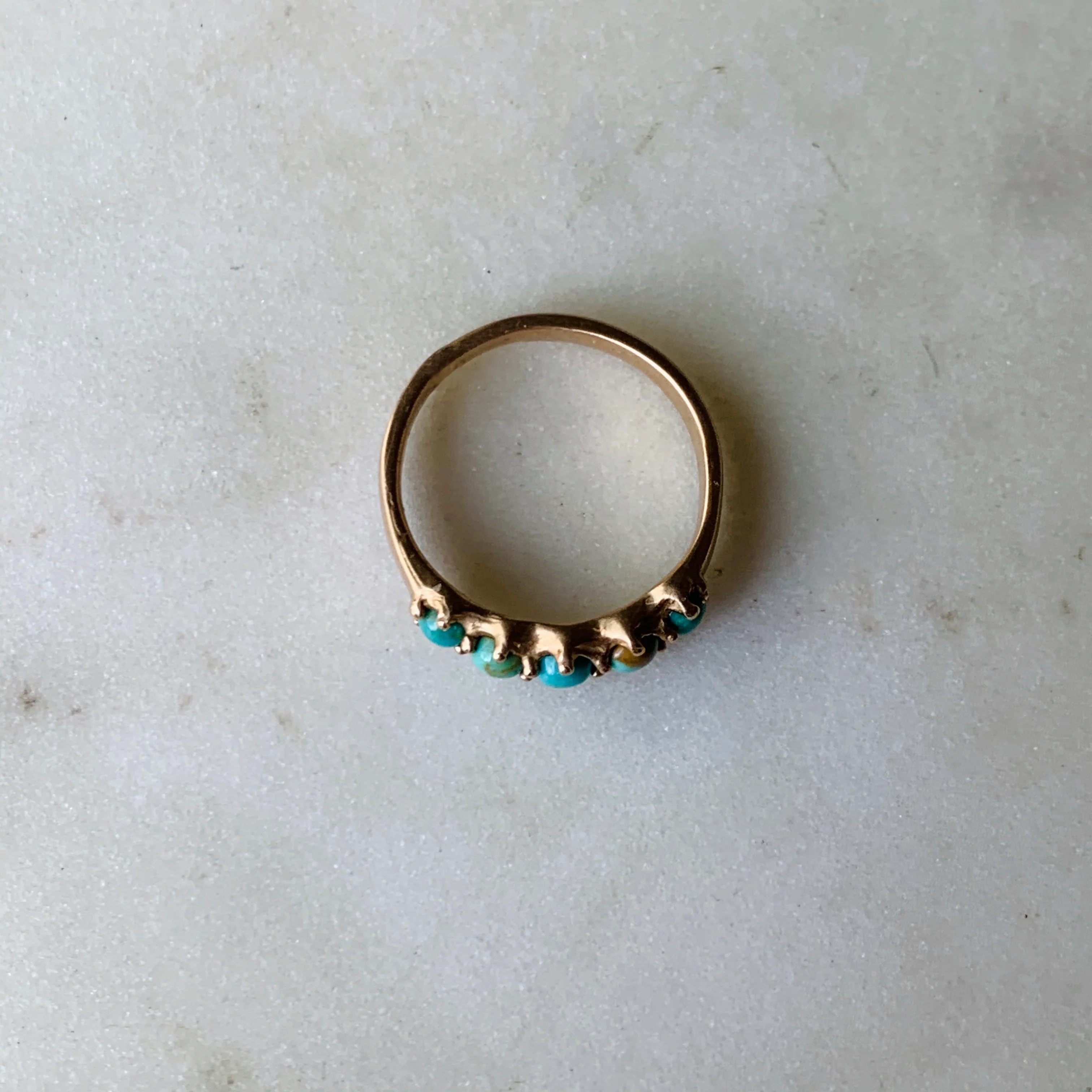 Five 3-millimeter turquoise stones are hand-set in this simple and delicate ring.